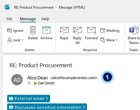 1. Attack launched from a compromised account. The phishing email bypasses Microsoft 365 native security and the SEG as it originates from a trusted domain and the sender and recipient have an established and trusted relationship. In addition, anti-phishing solutions that rely heavily on social graph technology will continue to perceive the account as trusted and won't classify the email as suspicious.