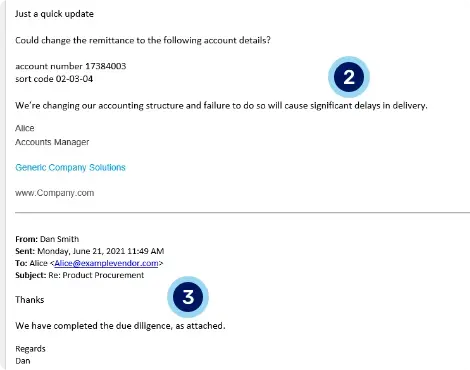 2. Linguistic analysis. KnowBe4 Defend uses natural language processing (NLP) to detect signs of financial information that, when combined with language indicative of repercussions, suggests financial phishing.3. Hijacked existing email chain. The attacker has hijacked an existing email chain that was likely leading to a payment request. This adds an air of authenticity to the email.
